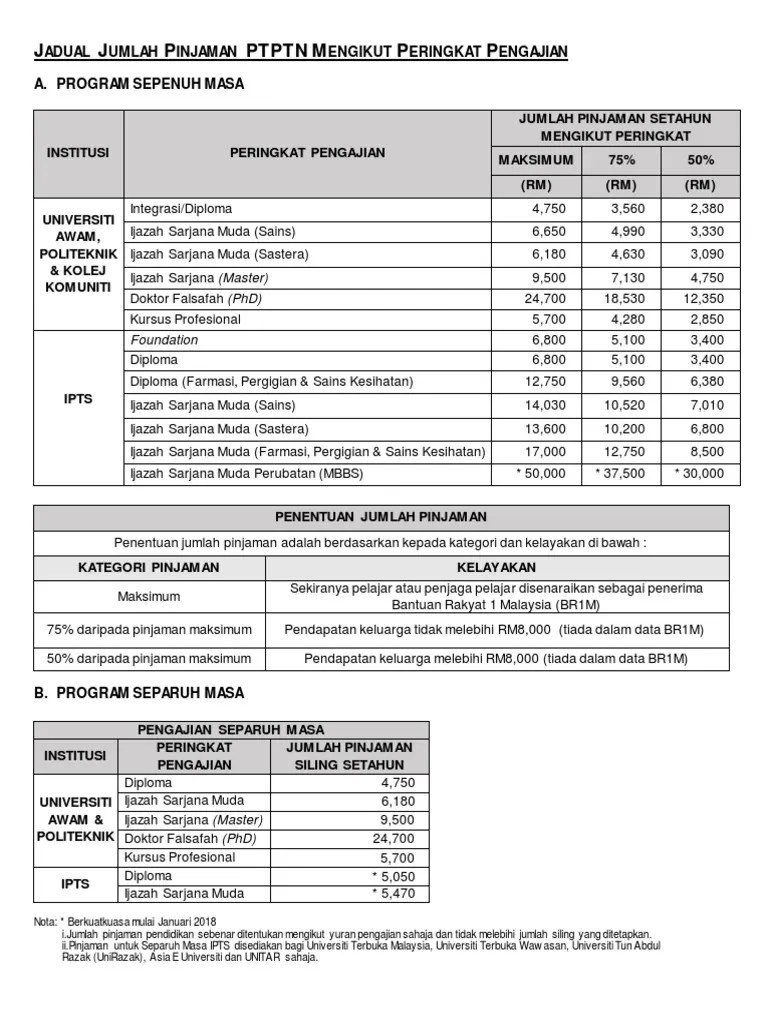 Peringkat jumlah pinjaman ditentukan berdasarkan kelayakan di bawah: . Jadual jumlah pinjaman ptptn m engikut peringkat pengajian. Senarai jumlah pinjaman ptptn untuk pelajar sepenuh masa atau separuh masa yang bakal melanjutkan pengajian di ipts, ipts, politeknik. Peringkat jumlah pinjaman ditentukan berdasarkan . Jumlah pinjaman ptptn adalah ditentukan berdasarkan status ibu bapa dan pelajar sama ada merupakan penerima bantuan raktayat 1malaysia . Jumlah pembiayaan pendidikan sebenar ditentukan mengikut yuran pengajian sahaja dan tidak melebihi jumlah siling yang ditetapkan. Jadual jumlah pembiayaan ptptn mengikut peringkat pengajian a. Berikut merupakan jumlah pinjaman ptptn yang diberi mengikut institusi dan peringkat pengajian yang boleh korang rujuk. Program sepenuh masa jumlah pembiayaan setahun mengikut peringkat* institusi peringkat . Skim pinjaman pendidikan ptptn diwujudkan bagi tujuan untuk memberi pinjaman.